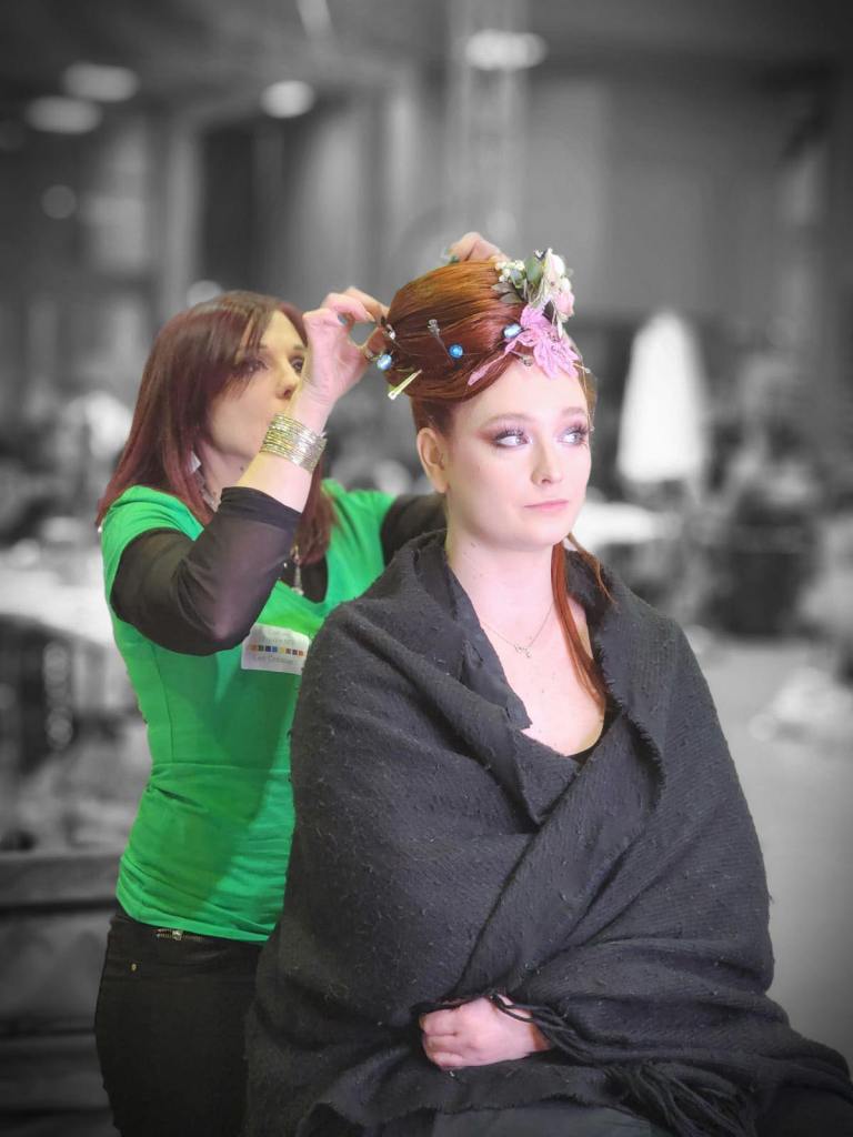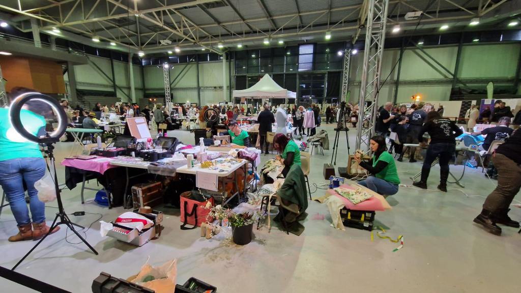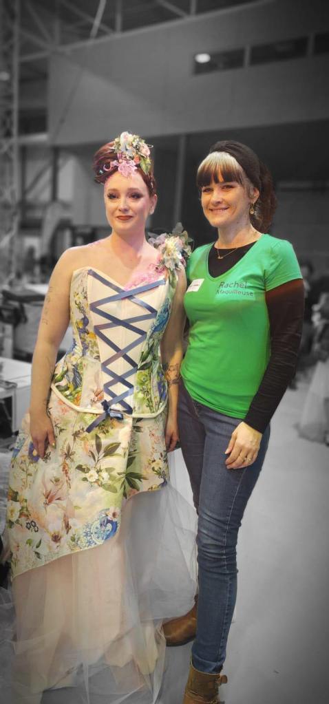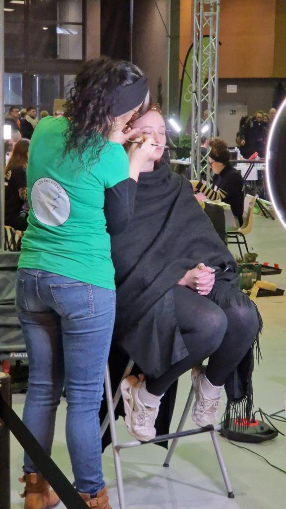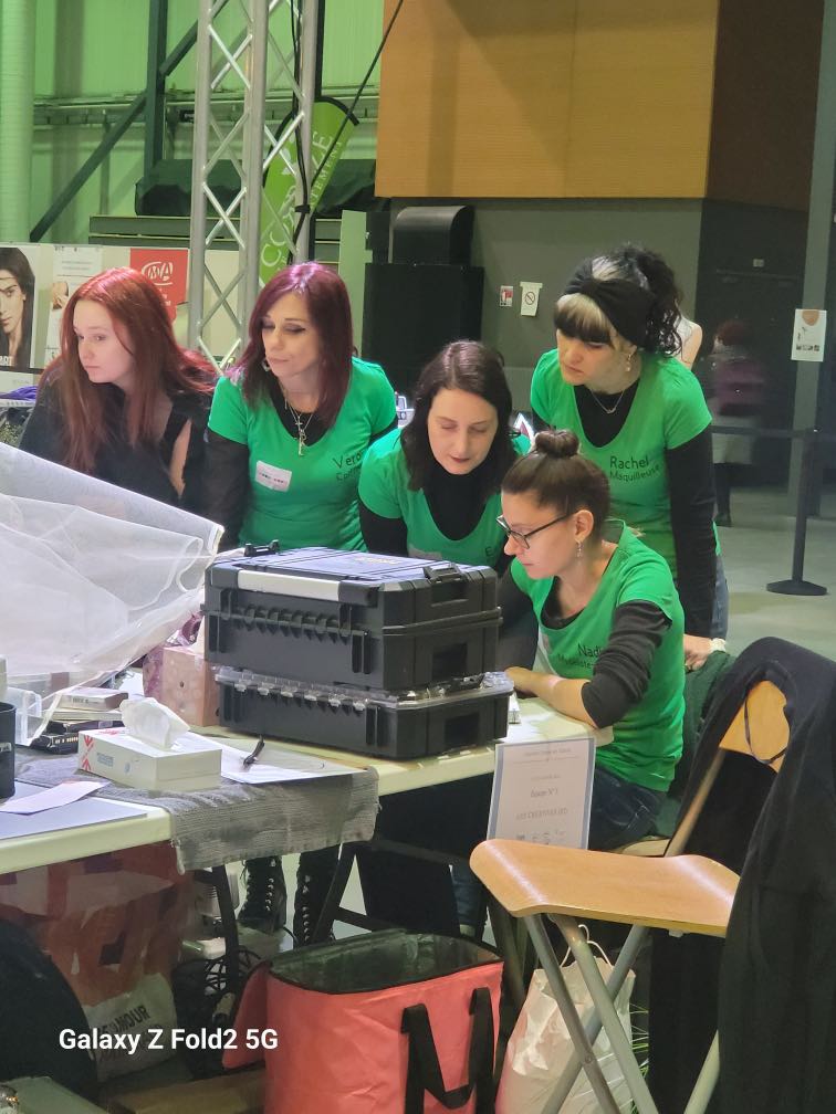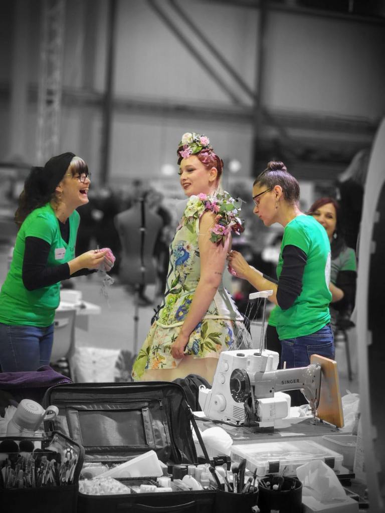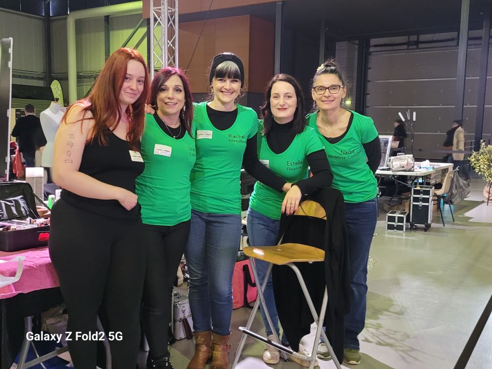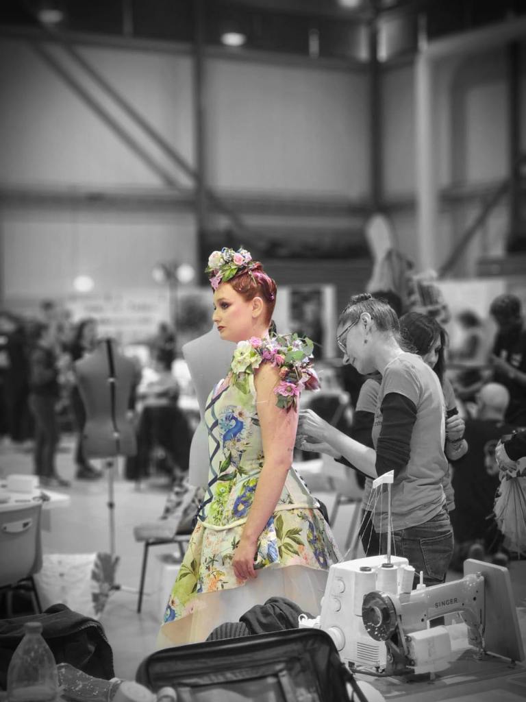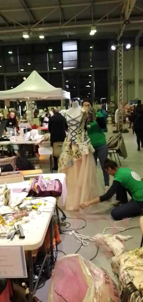 8h : nous sommes arrivées sur les lieux, à l’ Espace des Trois Provinces. Les 15 équipes auront chacune un ilot de 3 tables pour travailler : les mallettes de maquillage, le matériel de la coiffeuse, de la fleuriste, mes machines à coudre, le mannequin trouvent une place. Tout le monde s’installe avec une organisation au top de la part des personnes qui nous accueillent.