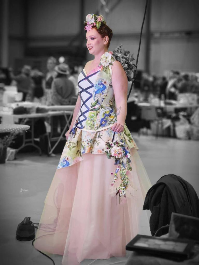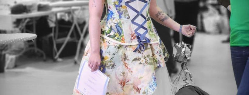 14h : je passe une dernière fois la jupe sous les aiguilles de la surjeteuse. Il nous faut habiller Sarah. Je croise tout ce que je peux intérieurement pour que tout aille bien ! Le premier essayage devra être le bon car dans 30 minutes l’épreuve est finie. Tout va bien, je fixe la bretelle de fleur avec un petit ruban au dos du corset.
