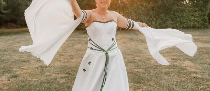Nous nous sommes mariés en février 2020, mais la recherche de la robe a débuté 18 mois plus tôt. Il me fallait avant tout une robe qui me permette de danser le rock que je pratique avec mon mari depuis plusieurs années. J’ai tout d’abord pensé à une robe courte, mais c’était difficilement compatible avec un mariage d’hiver. Notre budget ne nous permettant pas d’opter pour deux tenues, le choix de la robe a commencé à devenir un véritable casse-tête.