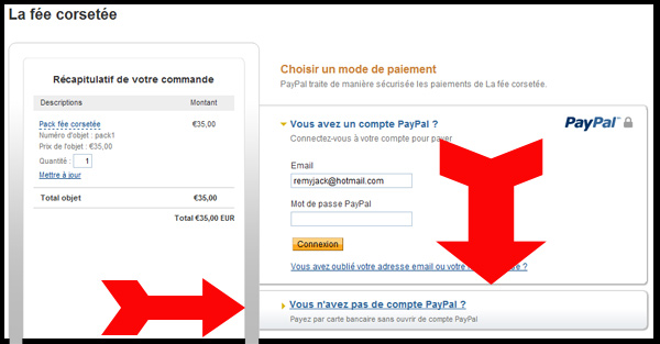 1/ Vous réservez le pack au plus vite (il n’y en a que 100!) avec le bouton Paypal qui s’affiche plus bas sur cette page. Vous pouvez payer avec un compte Paypal ou une carte bancaire en cliquant sur « Vous n’avez pas de compte Paypal » (voir la photo d’explication ci-dessous).